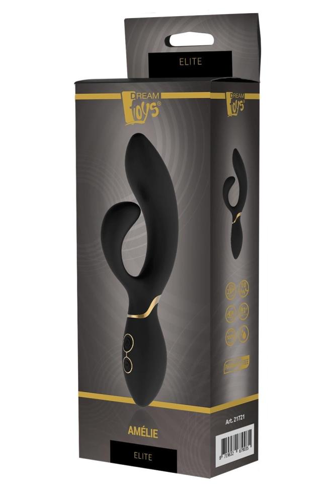 Колекція Elite від Dream Toys - створена дарувати не тільки еротичне задоволення і екстаз, але й візуальне задоволення. Два потужні мотори працюють одночасно і забезпечують 7 сильних та глибоких вібрацій у трьох швидкостях. Гнучкий і податливий вібратор-кролик підлаштуватися під усі ваші інтимні зони, доставляючи незабутні задоволення. Також вібратор може залишатися у зігнутому положенні. Завдяки водонепроникному захисту (IPX7) це девайс радуватиме вас скрізь, де ви прагнете гарячих хвиль збудження. Його також легко очистити водою з милом або дезінфікуючим засобом для чищення іграшок. Вібратор Amélie заряджається за допомогою USB-кабелю, що додається. Він виготовлений з харчового силікону та ABS, водонепроникний та безпечний для тіла, не містить фталатів та латексу. Управління може бути виконане за допомогою 2 кнопок на підставі вібратора: верхня кнопка для включення / вимикання вібратора, нижня кнопка для перемикання програм вібраціїОсобливості: Гнучкий і пружний кролик, що утримує зігнуту позицію. з м'якого харчового силікону та АБС-пластику. Водонепроникний IPX7 Розміри: загальна довжина 20 см, вставна довжина 10 см, діаметр верху 3,6 см, діаметр кролика 2,4 см.